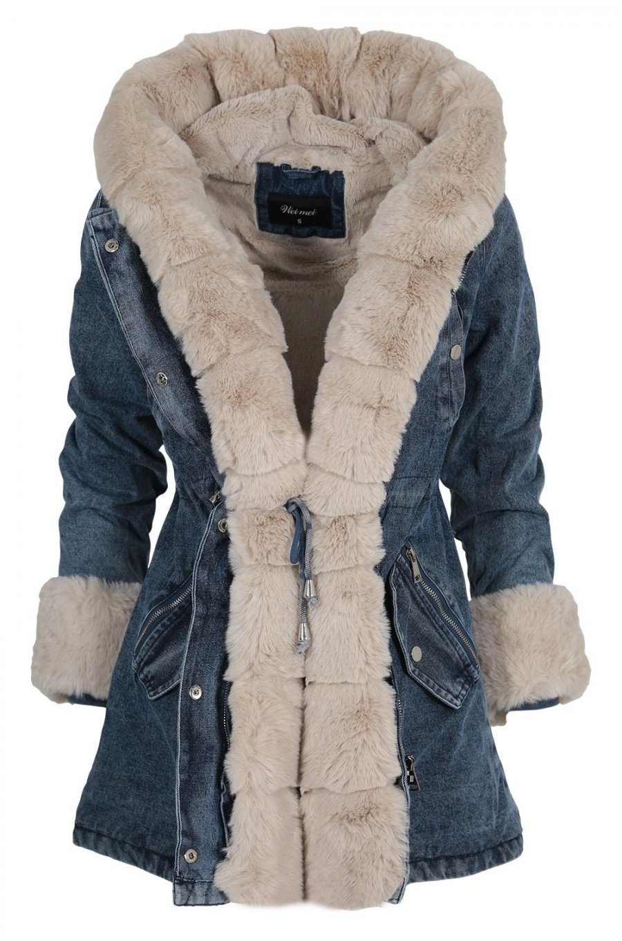 Geaca dama parka din denim albastru cu blanita eco bej Wanda - Descriere si specificatii
