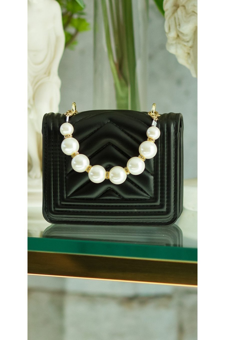 Geanta dama eleganta, din PU, neagra, cu perle si lant auriu, Jessy