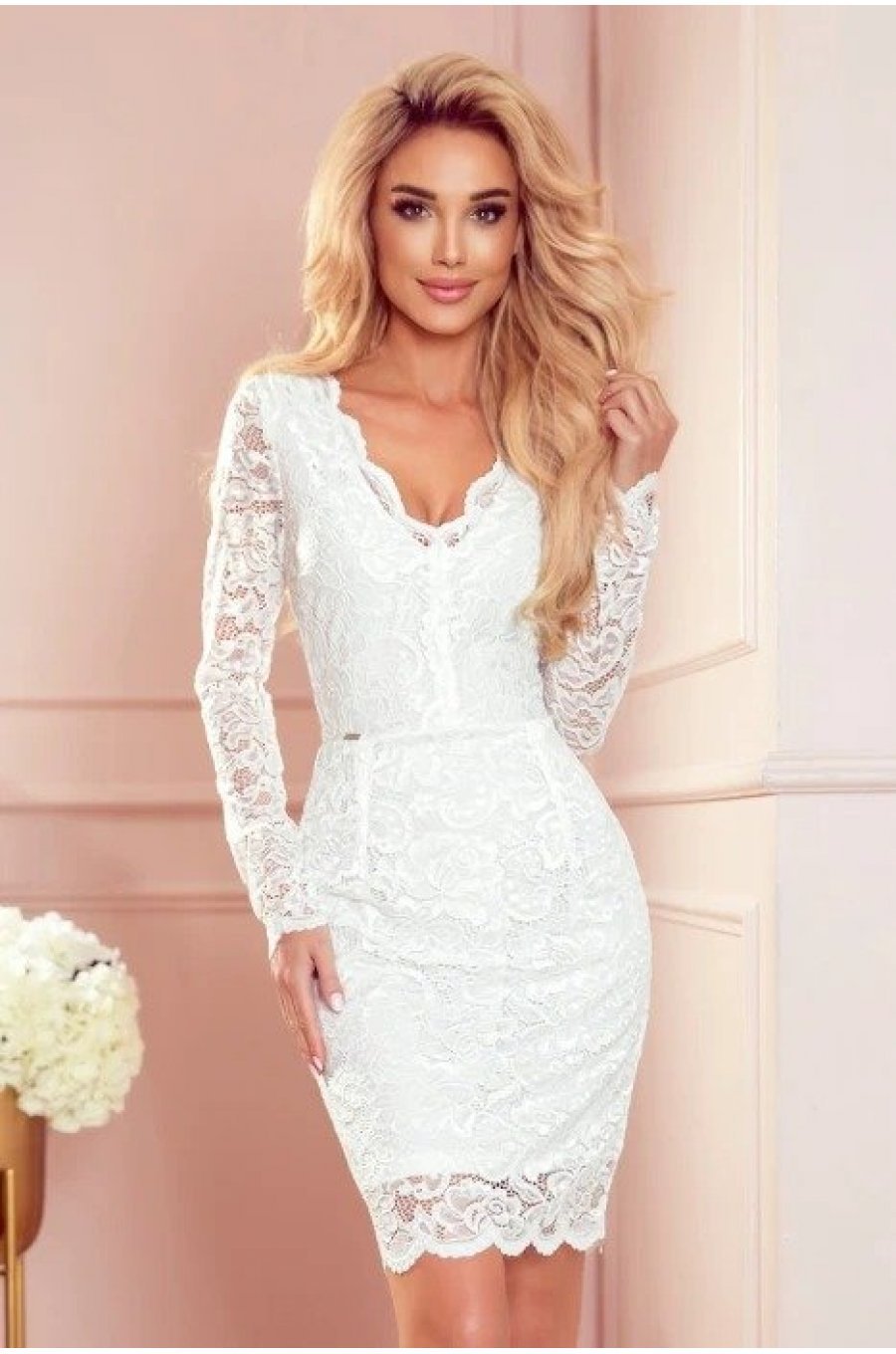 Rochie cununie civila midi, din dantela, alba, cu maneca lunga, Sofia