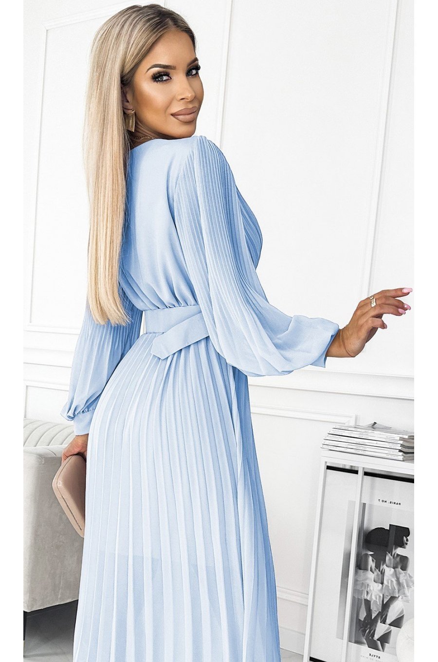 Rochie plisata lunga, din voal chiffon, bleu, cu maneca lunga, vaporoasa, Vaneira - Descriere si specificatii